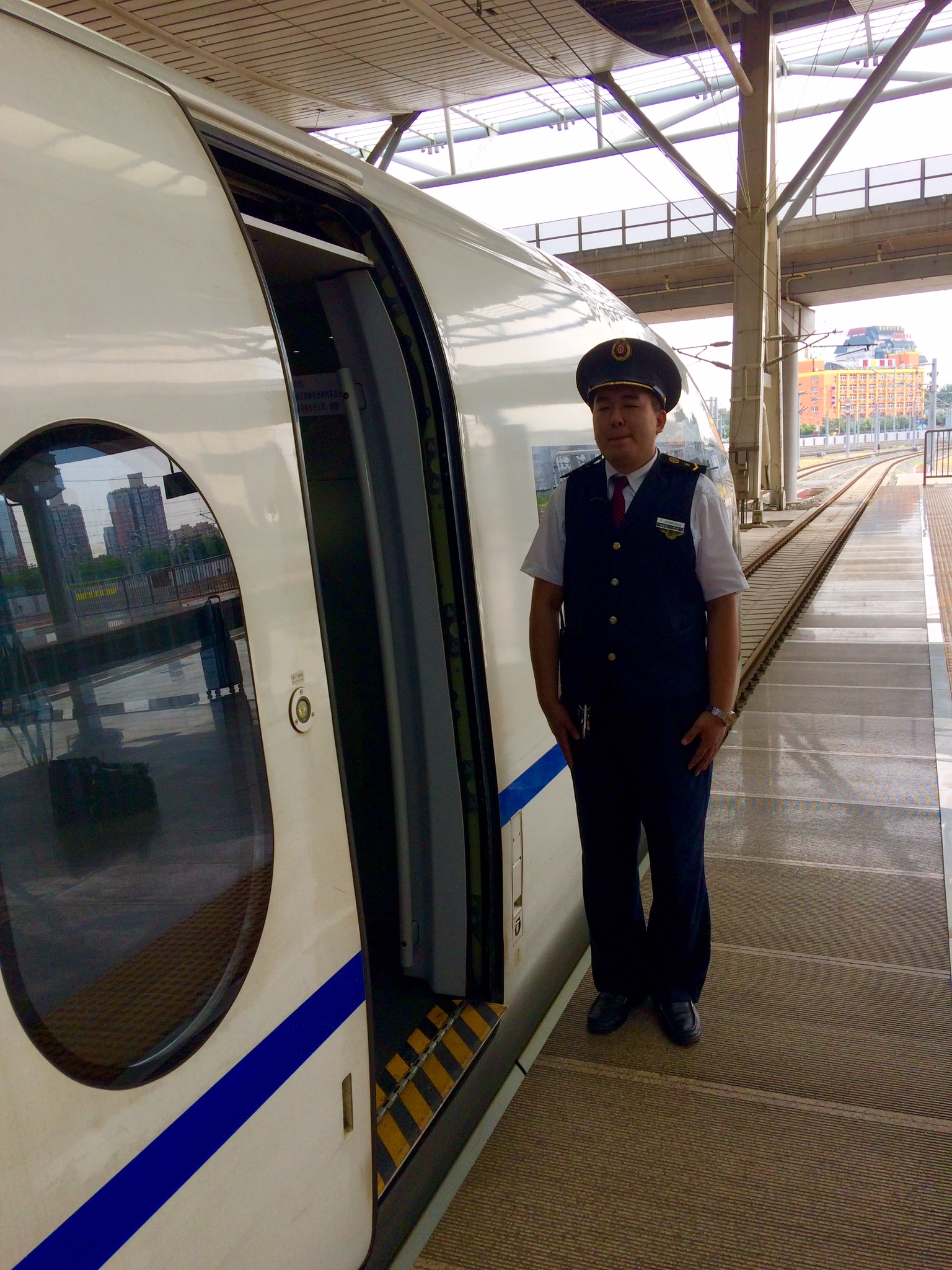 Og disse meget smarte tog er betjent af smart uniformerede vagter, der står ret mens du boarder. Jinan ligger 400 km syd for Beijing, og vores rejse dertil tog kun 90 minutter – med en topfart på 302 km/t (hjælpsomt indikeret på en skærm i togvognen).