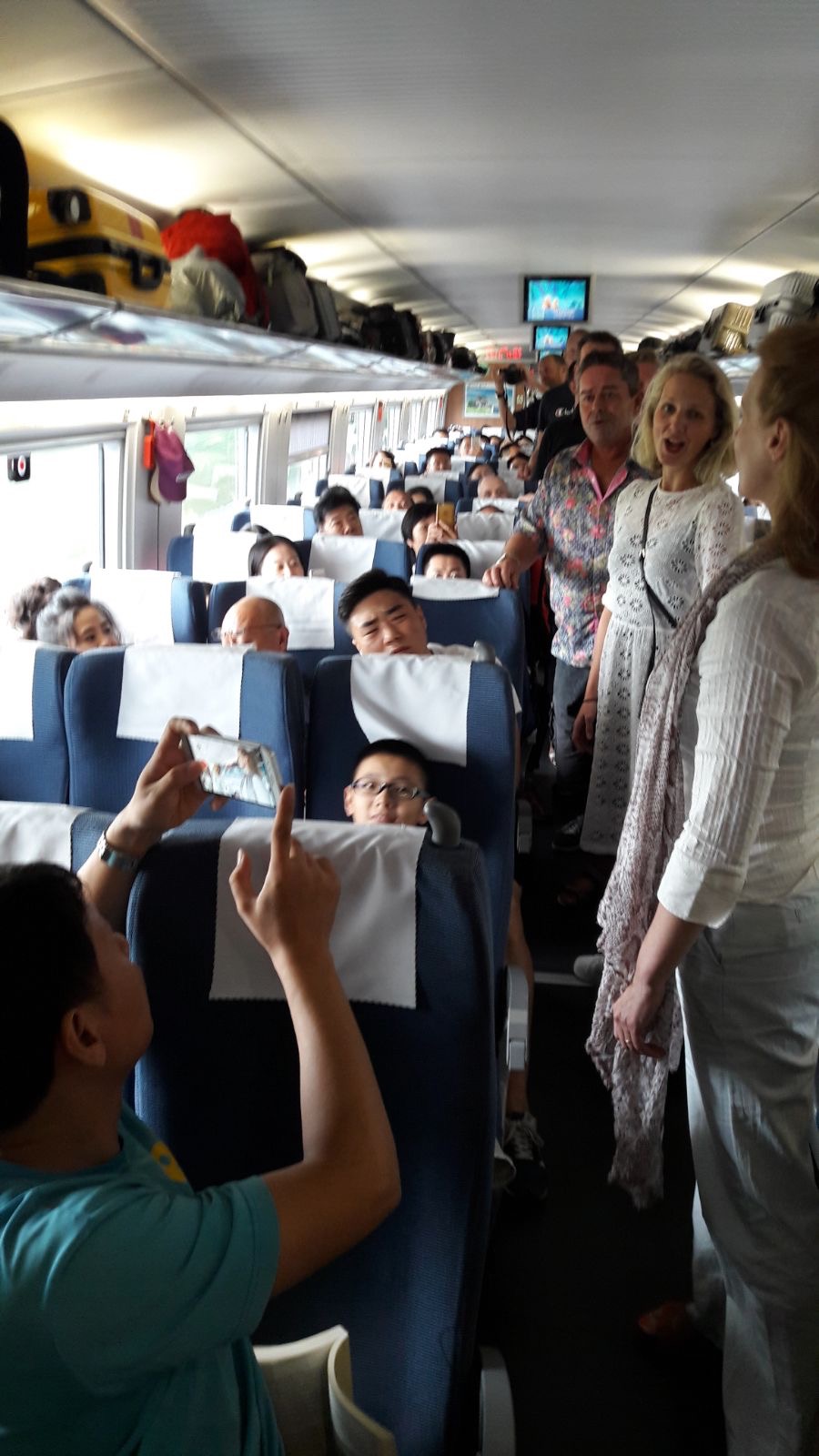 Efter rejsen fra København dagen før og en tidlig start på morgenen, var togturen en velkommen lejlighed til at slappe lidt af, indhente noget søvn eller blot stirre på det kinesiske landskab som det strøg forbi os udenfor. Men vi greb også lejligheden til at underholde vores medpassagerer – hvilket de lod til at nyde meget!