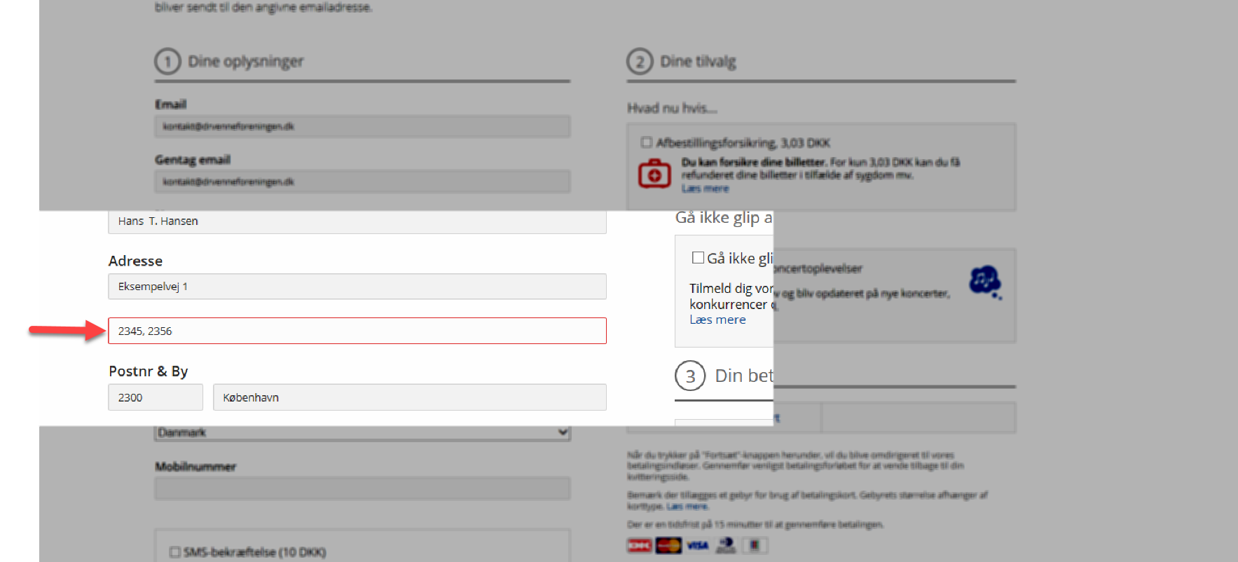 Ønsker I at sidde flere sammen, skal dette blot opgives når I bestiller billetterne. Det er muligt at bestille op til 10 billetter. Hvis i vil sidde flere sammen, skal I blot opgive medlemsnumrene på de medlemmer i vil sidde sammen – dette skal skrives i nederste adressefelt ved bestilling – der står ‘Evt. ekstra addresse’ i feltet. Se billederne nedenfor: