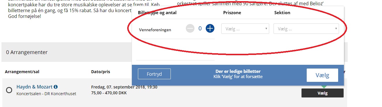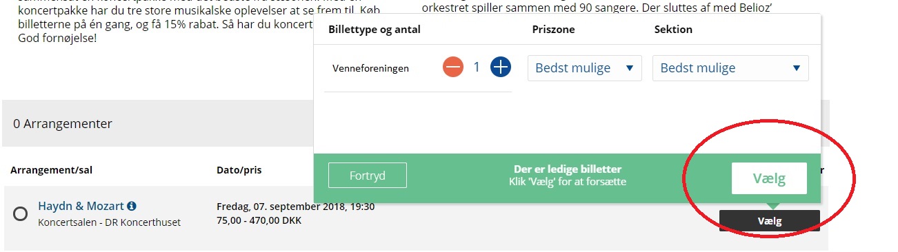 BEMÆRK: Først efter du har valgt alle arrangementer du vil til, samt antal billetter og trykker på ‘Fortsæt’, tildeler systemet dig dine pladser.