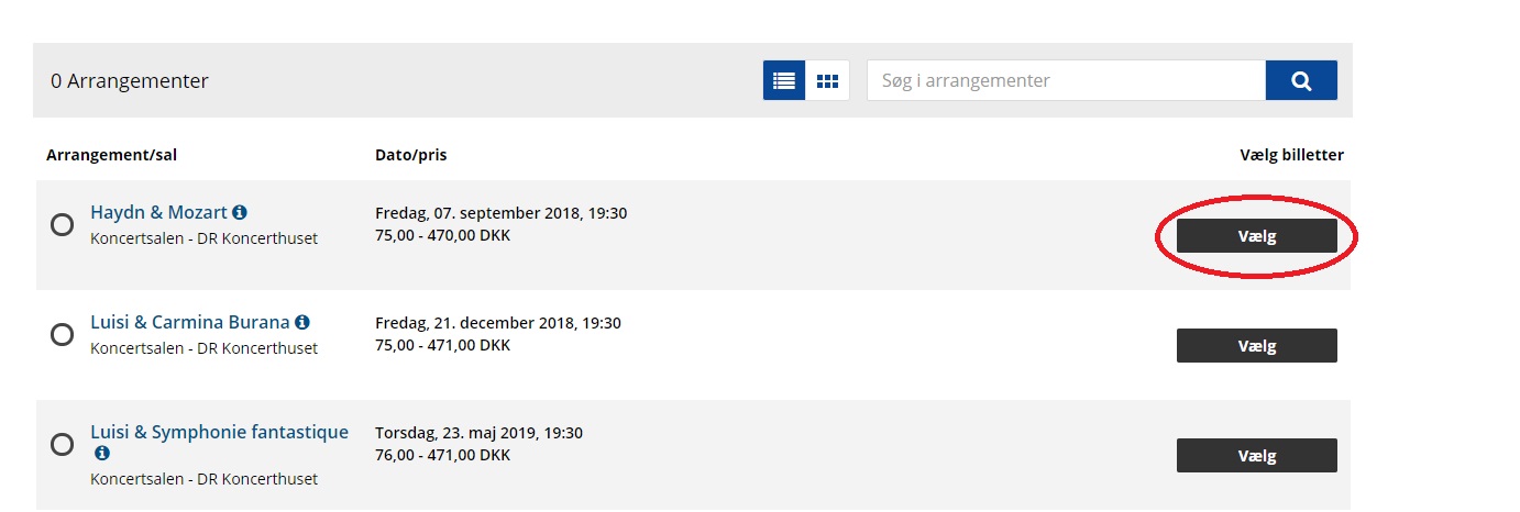 Tryk på den for at komme til siden hvor du kan købe billetter. Når du har trykket på den, vil du komme til en side med en oversigt over alle vores arrangementer og ud for hvert arrangment er en knap hvor der står “Vælg” – tryk på den for at vælge billetter.