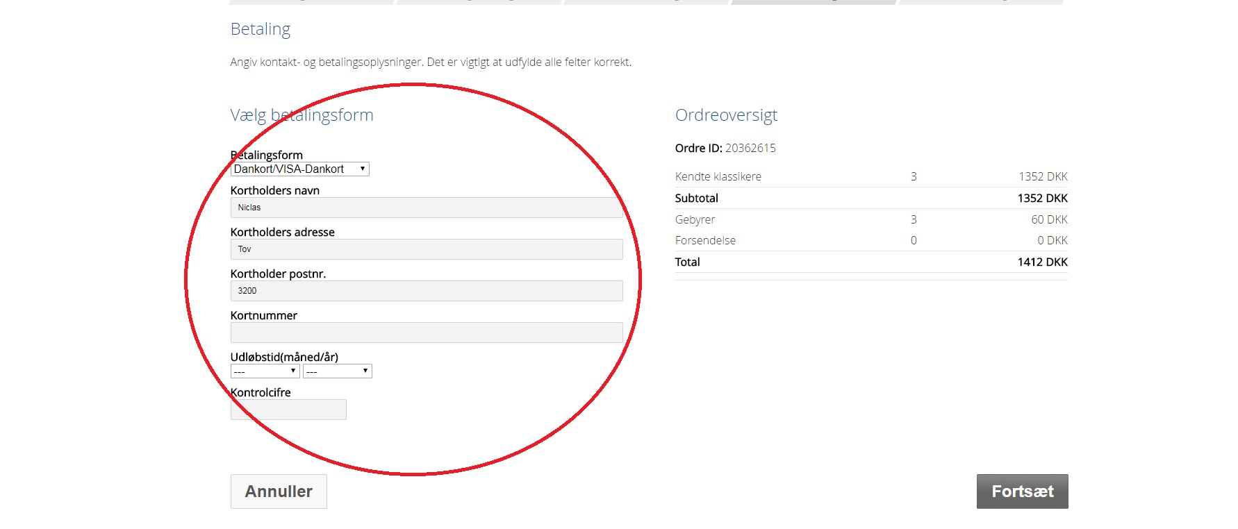 Her efter skal du vælge betalingsform og indtaste dine kortoplysninger. Når det er gjort, tryk da på fortsæt.