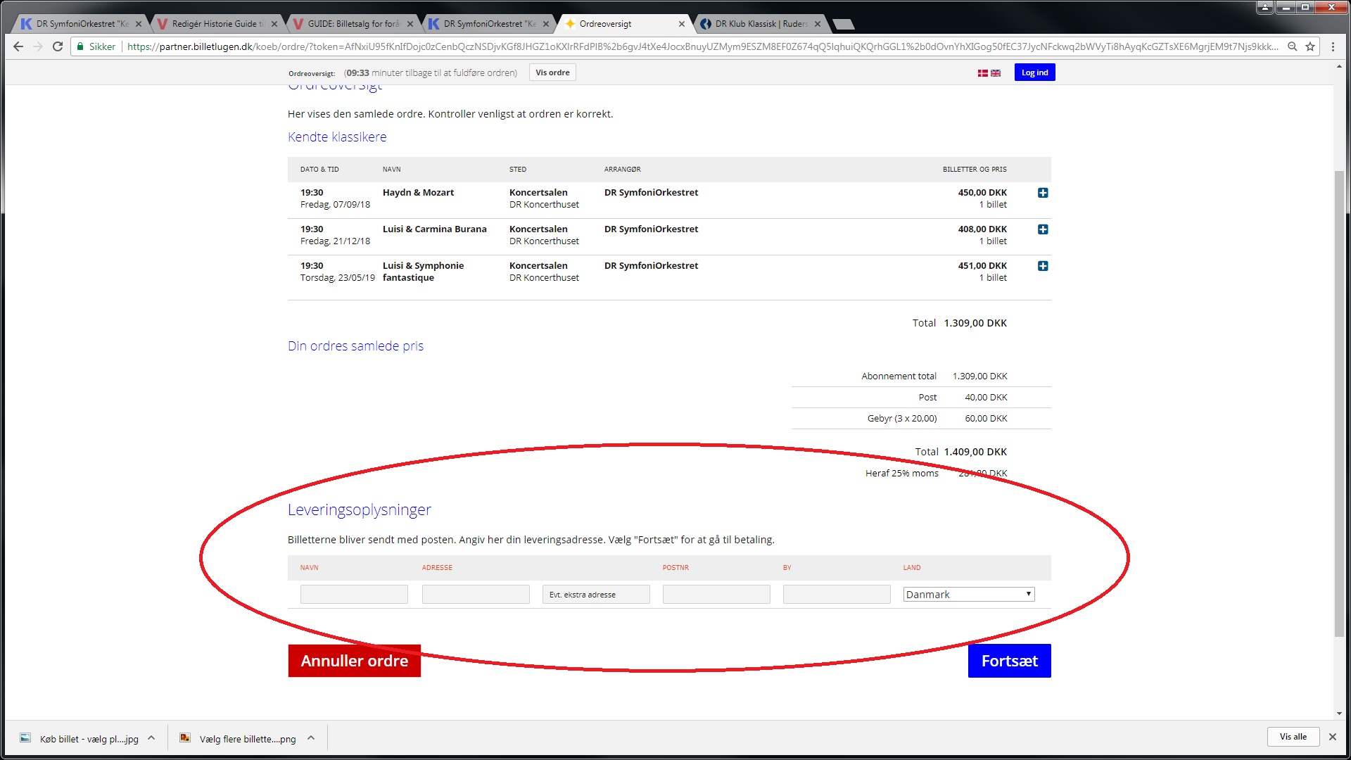 Du kommer nu til en side med en oversigt over hele din ordre. Hvis du har valgt at få billetterne sendt med posten, udfyld da under ‘Leveringsoplysninger’ det navn og den adresse billetterne skal sendes til. Tryk derefter på ‘Fortsæt’.