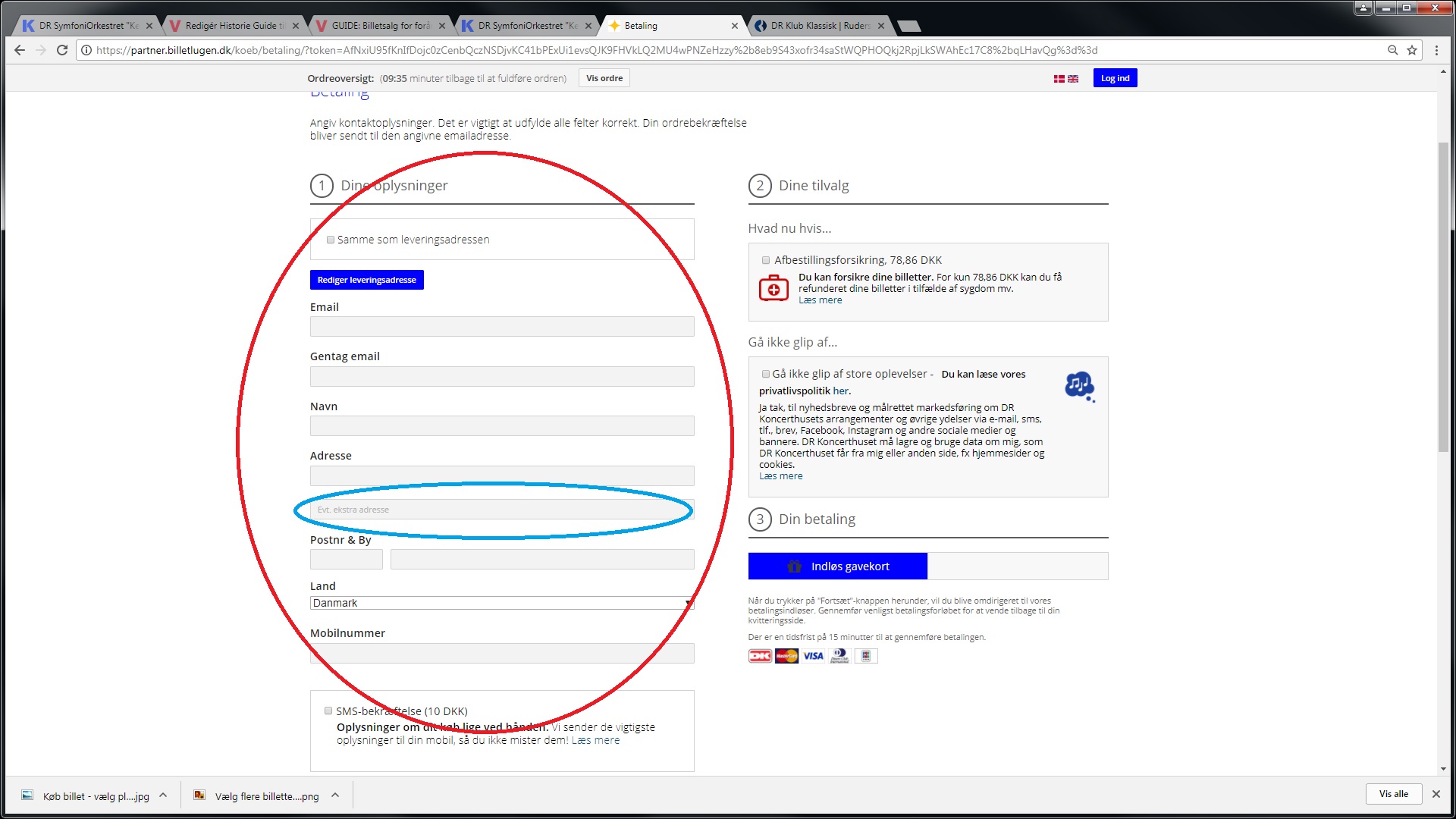 Hvis du køber mere end en billet, skal du i feltet hvori der står ‘Evt. ekstra adresse’, udfylde medlemsnumre på de medlemmer du køber billet for. Det er markeret med en lyseblå cirkel herunder.