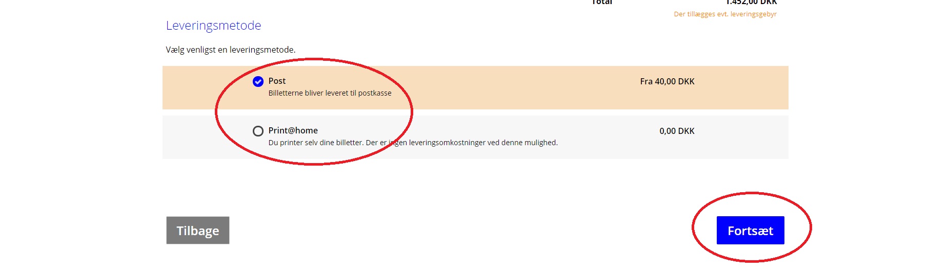 Når alle billetter er som de skal være, så skal du vælge hvordan du ønsker dem leveret. Du kan enten få dem tilsendt med posten, sæt da et blåt hak ud for ‘Post’, eller få dem sendt på mail og selv printe dem, sæt da et blåt hak ud for ‘Print@home‘. Klik derefter på ‘Fortsæt’