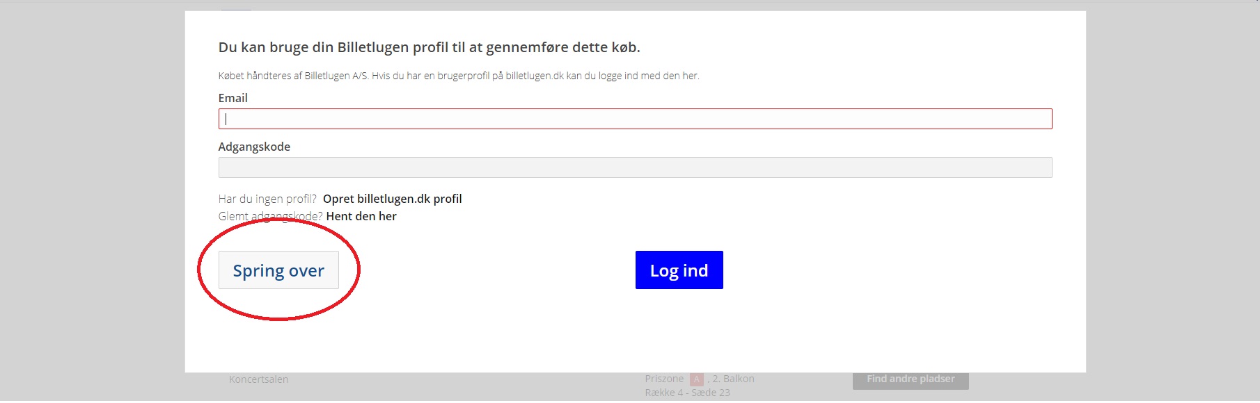 Hvis du har login til Billetlugen kan du indtaste det her, men eller tryk da blot på ‘Spring over’.