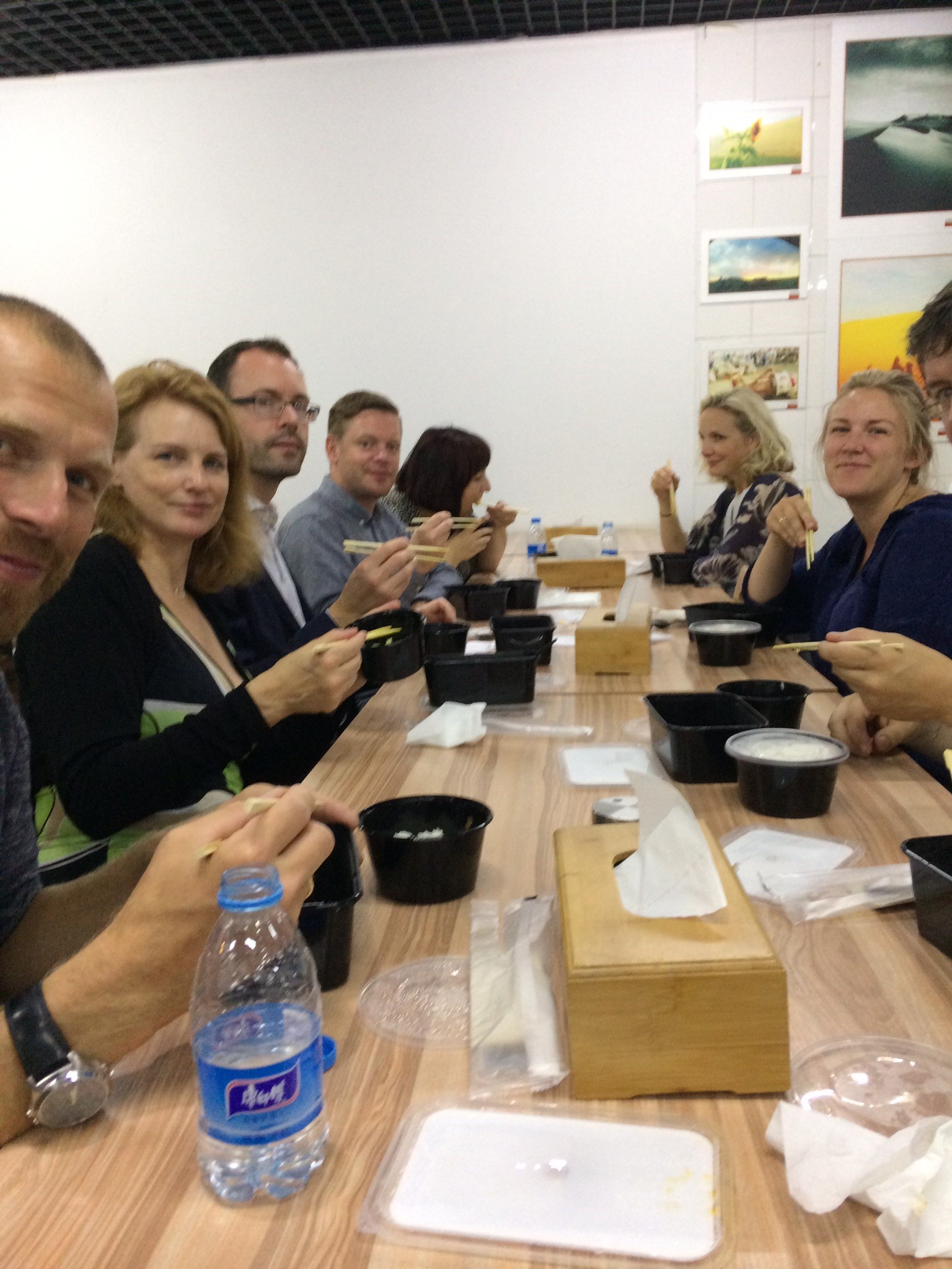 Efter en hurtigt prøve i koncertsalen var det tid til fællesspisning i medarbejderkantinen. Vi er alle ved at blive ret så gode til at spise med pinde!