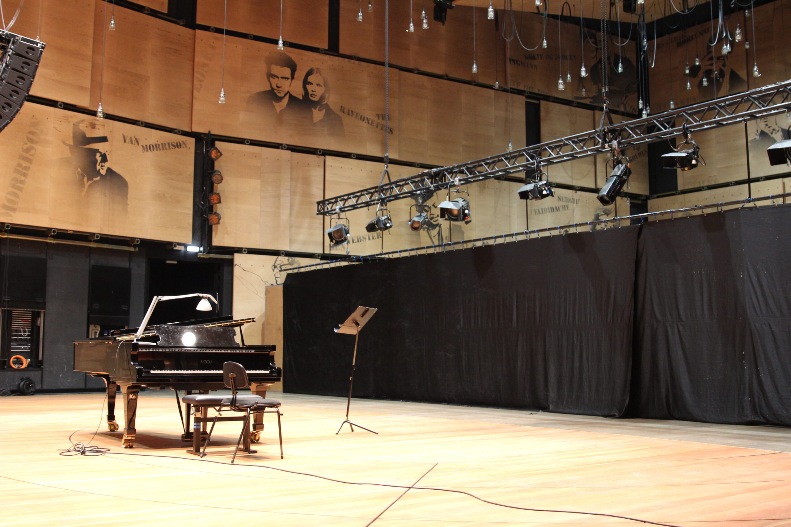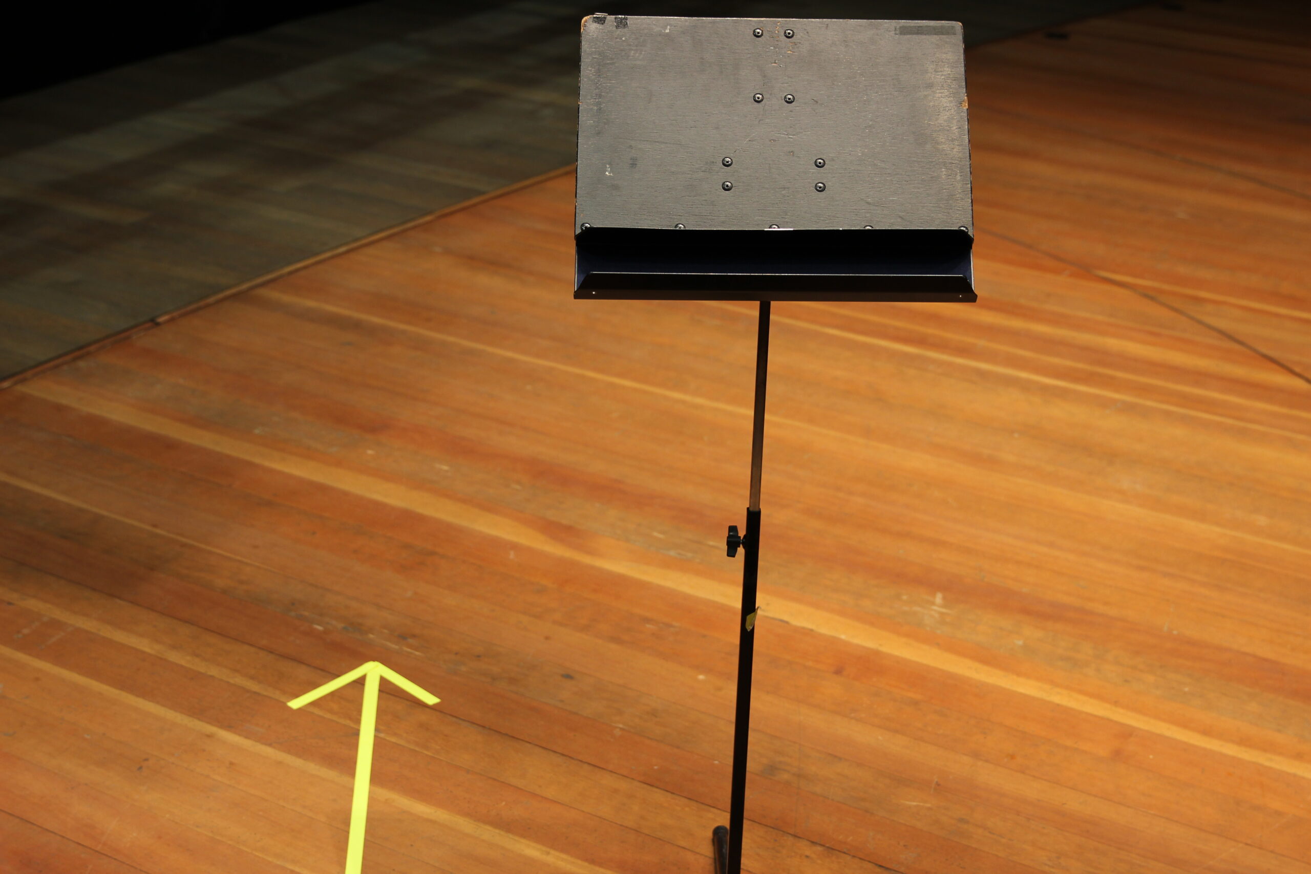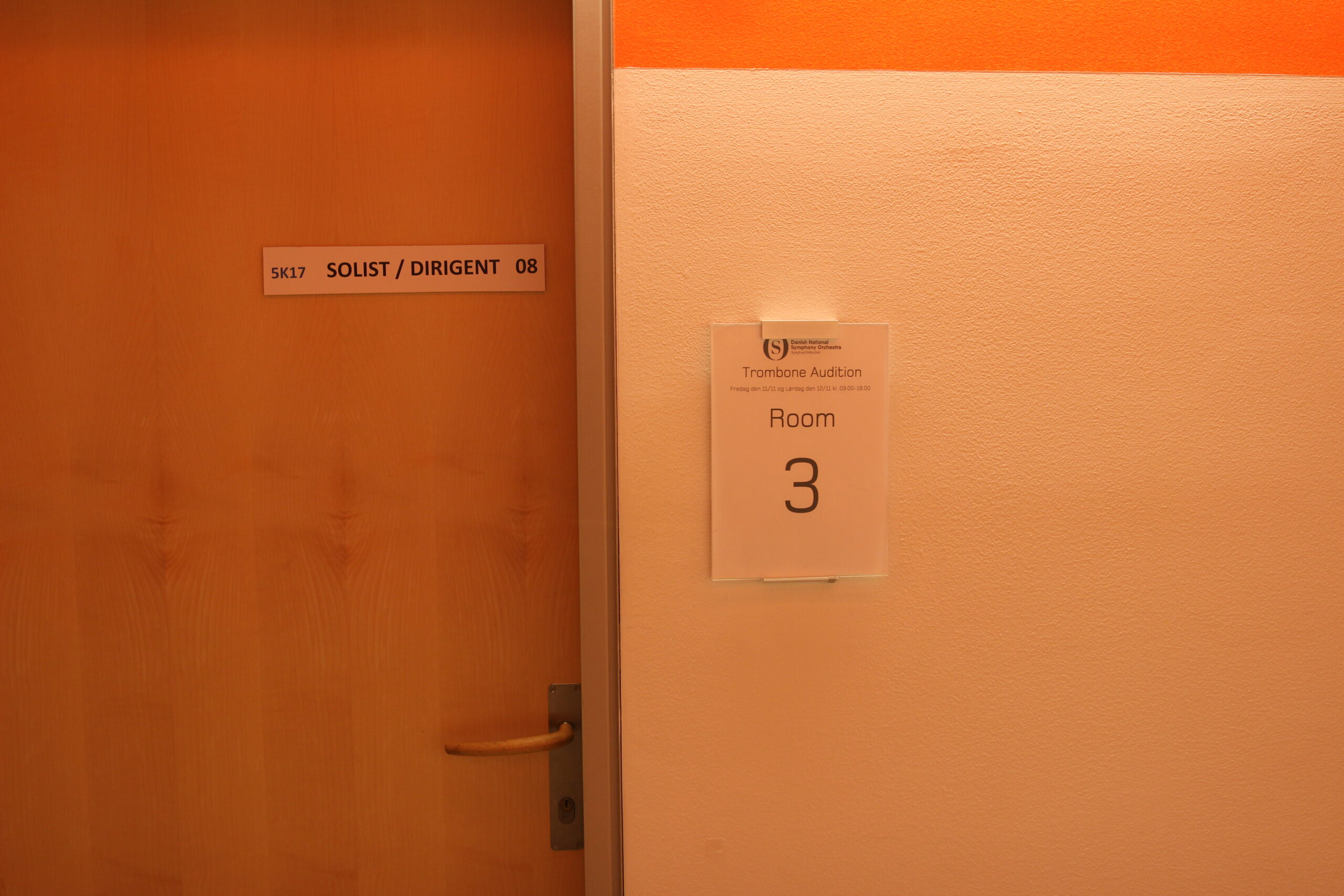 Gennem lokalet strækker sig en række af borde med tilhørende stole. Om et par timer vil juryen sætte sig på stolene, og foran dem vil der blive rejst en skærm. Af musikinstrumenter ser man kun et flygel i lokalet. Alle kandidater – uanset deres instrument har en af de to akkompagnatører, der er tilknyttet prøverne, til at støtte sig gennem forløbet. Repertoiret er kendt mindst tre uger i forvejen, oftest vil det fremgå af stillingsopslaget.