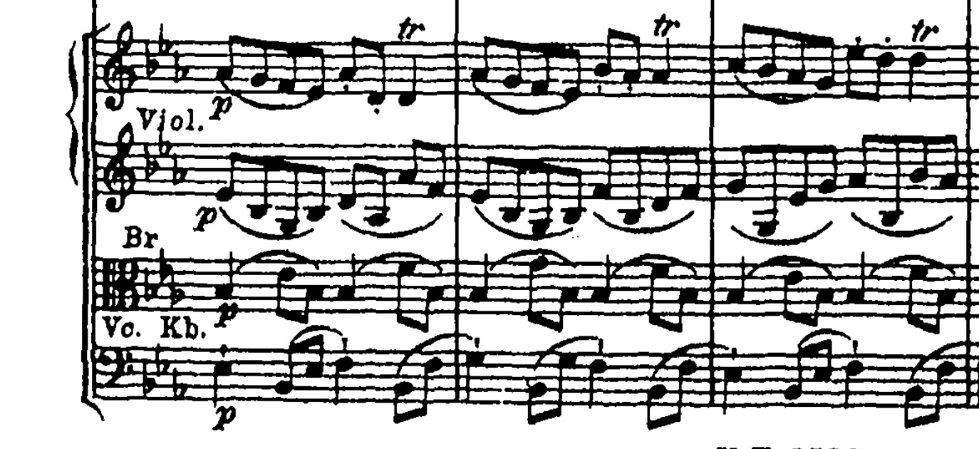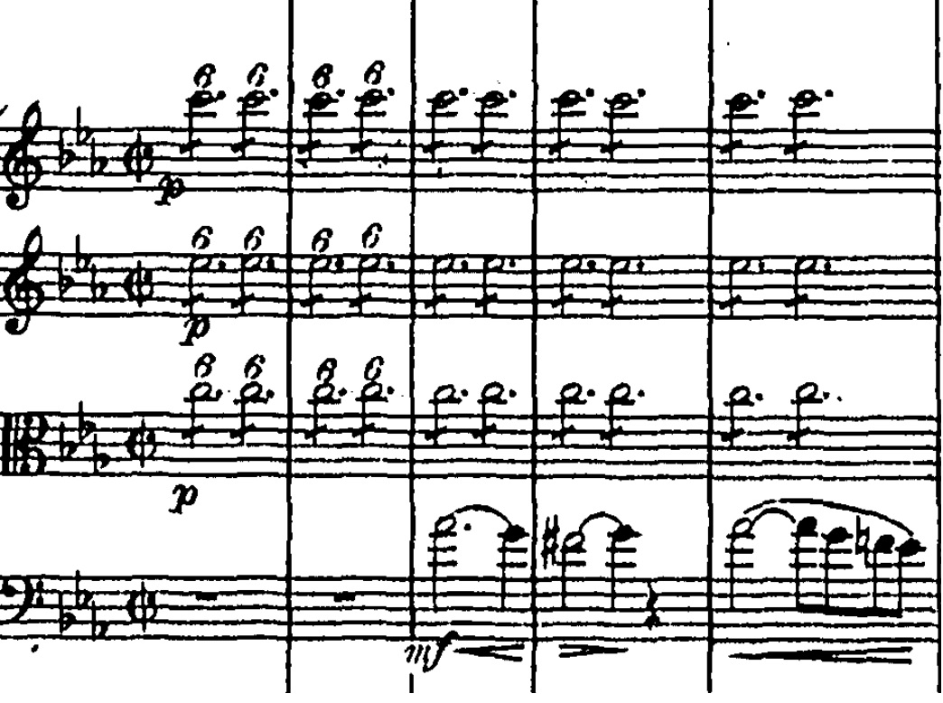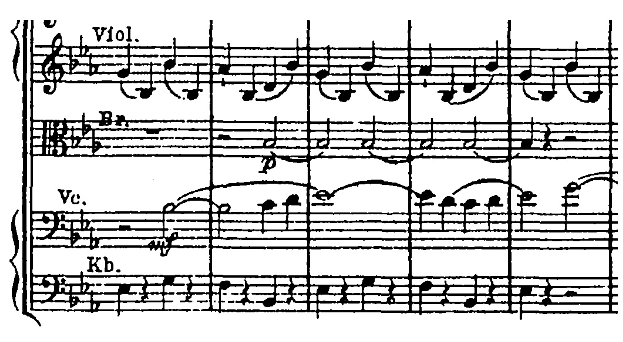 Symfonien begynder med tremolo i de lyse strygere. Tremolo er når den samme tone gentages, så vi får en ‘de-de-de-de-de-de’ lyd fra violiner og bratscher. Under dette lægger celli en melodisk frase, som bliver besvaret med en nedgang i horn.