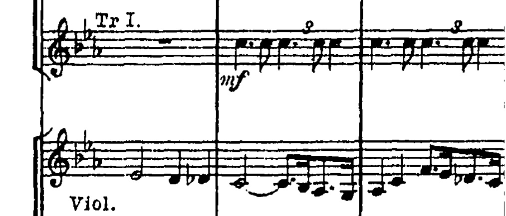 Violinerne får dog ikke deres øjeblik alene, da trompeterne indskyder en fanfare. Denne fanfare er værd at huske på, da den optræder flere gange i satsen: