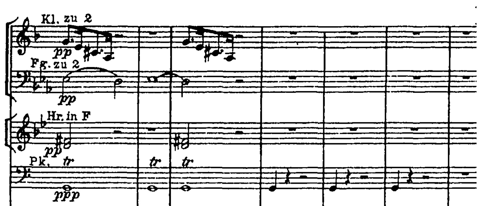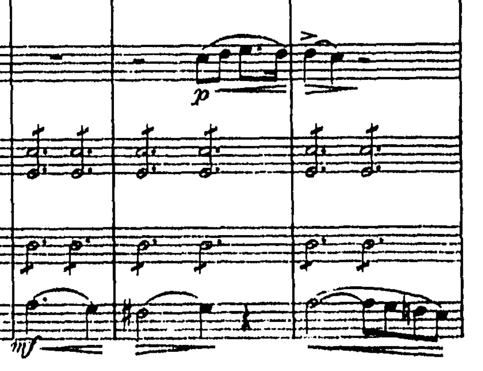 Dette sammenspil fortsætter i det næste stykke tid, indtil fløjten skærer igennem med en nedadgående figur, som bliver overtaget af klarinetten. Samtidig falder tempo og intensitet og vi hører til sidst kun tre slag på pauken: