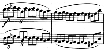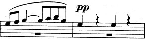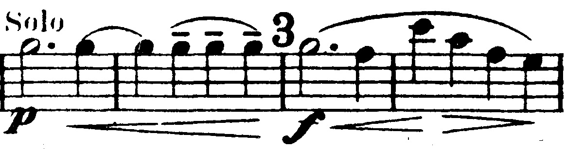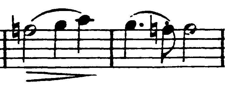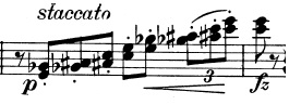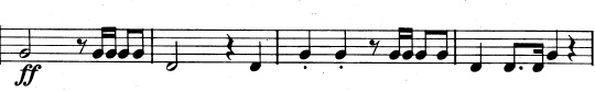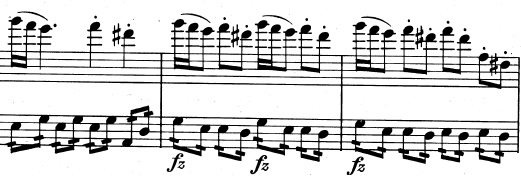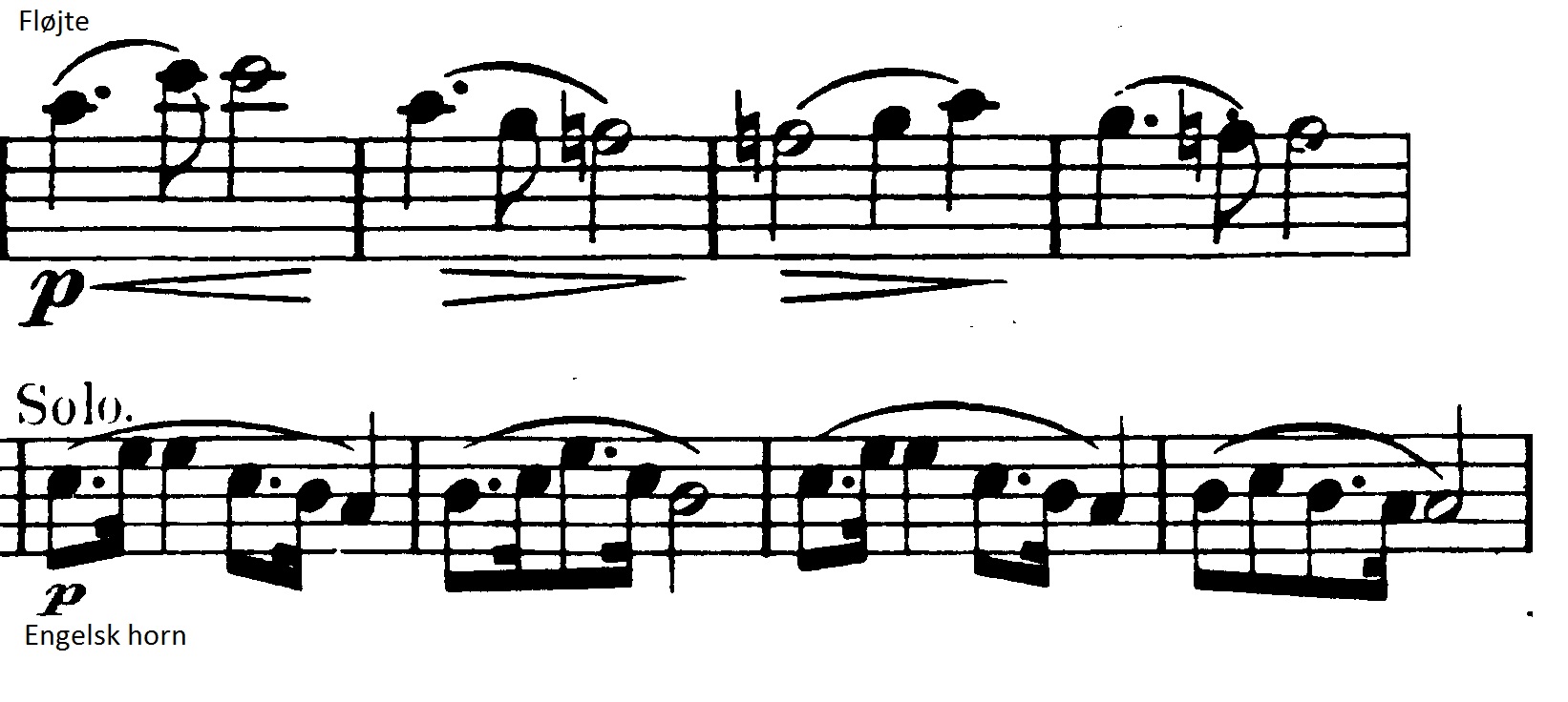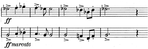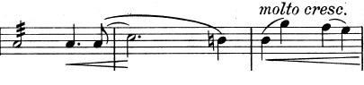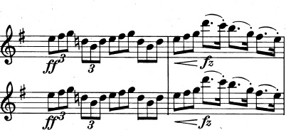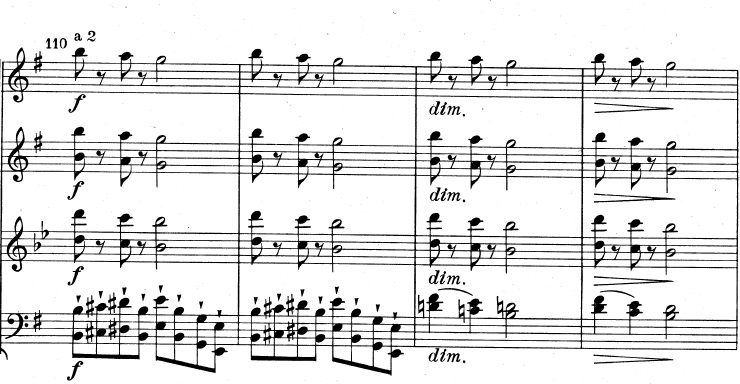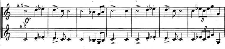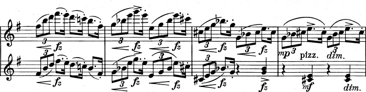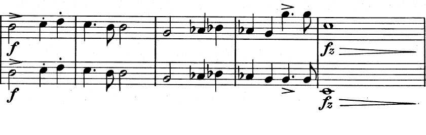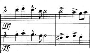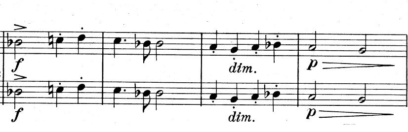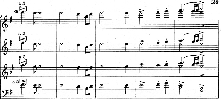 Og en mere generel idé, der består af trinvist nedadgående toner. De nedadgående toner suppleres af fagotterne, der spiller en variation over violinernes tema fra før, indtil også de går med nedad: