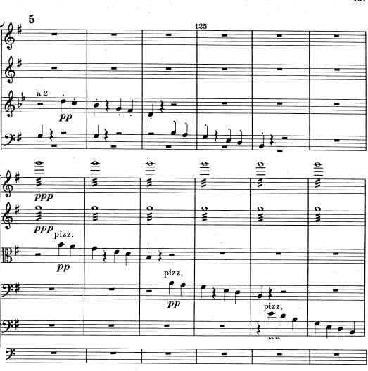Nu er det, som om kraften går af orkesteret, der er færre og færre instrumenter, og strygerne spiller den samme frase i ring. Men pludselig spiller fagotterne en optakt: