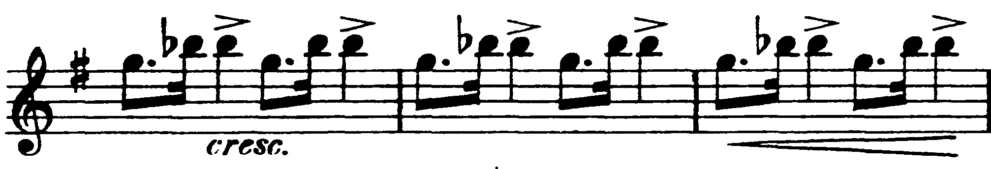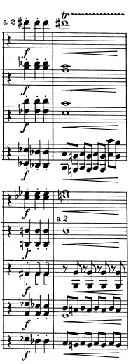 Dette mønster gentages: Nedadgående tema i toppen, variation over hovedtema i hornene, nu endnu mere forvrænget: