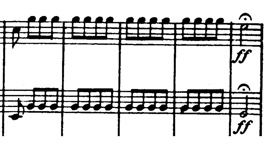 Denne gang spilles det i fagotterne, der ikke har samme slagkraft som basunerne. Derfor bliver samspilet med træblæserne efterfølgede ikke lige så kontrastfyldt, og fagotterne danner en smuk klang, der ligger under de melodiske fraser der følger.