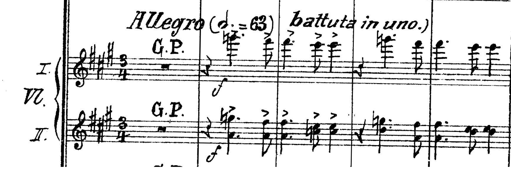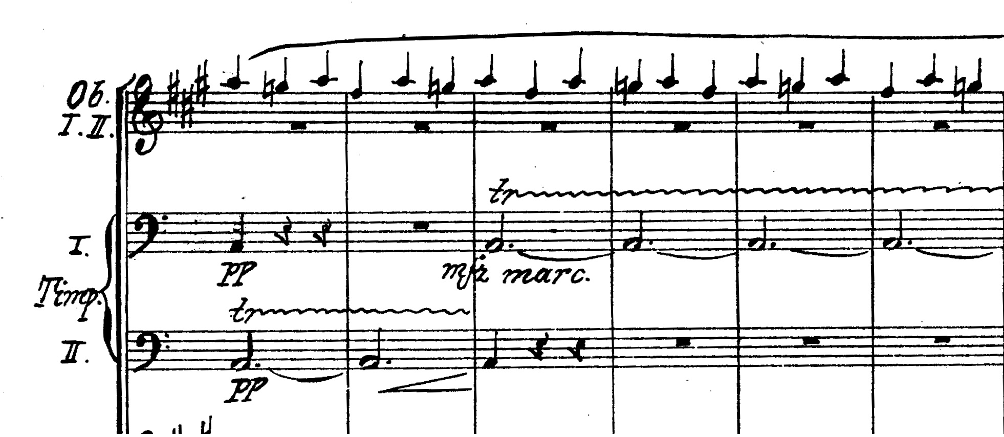 Satsen foregribes af en stille obosolo, der spiller en kort melodisk frase, inden den insisterende istemmer den samme tone adskillige gange, indtil violinerne overtager lydbilledet: