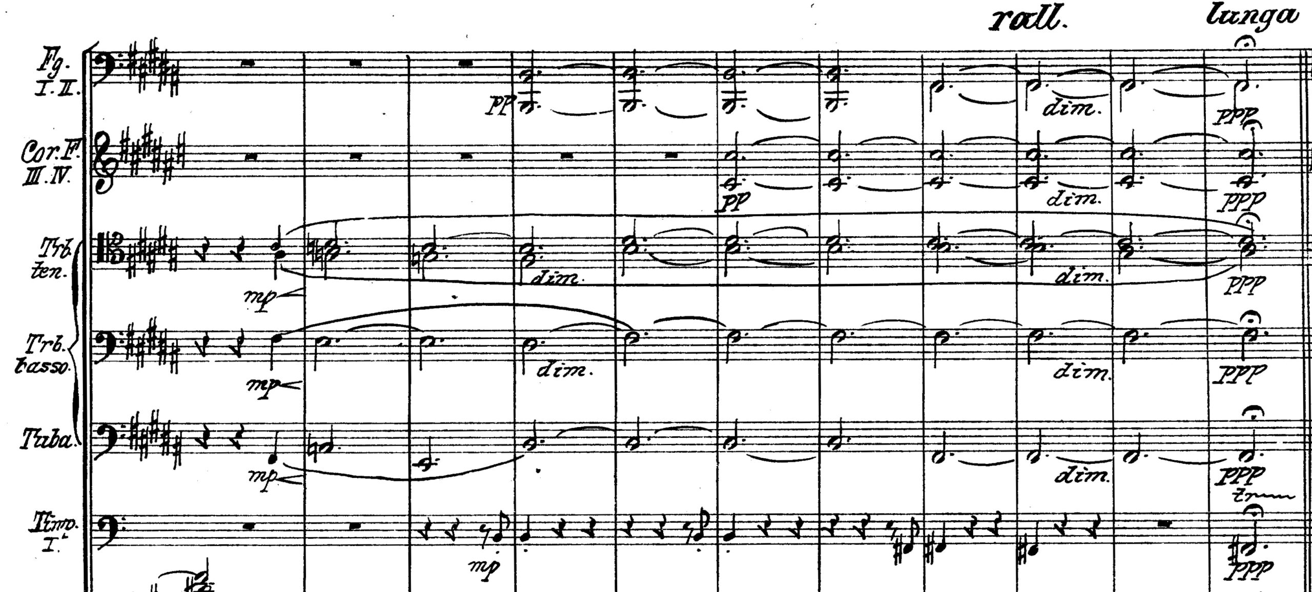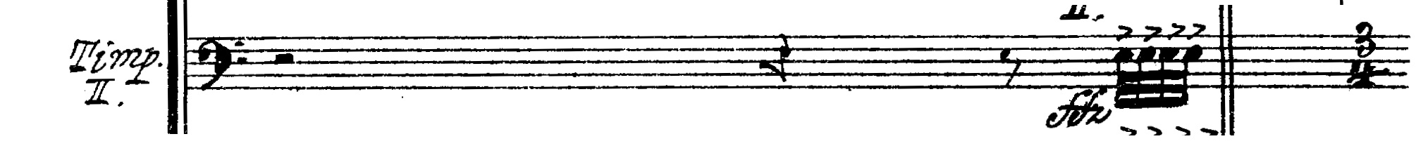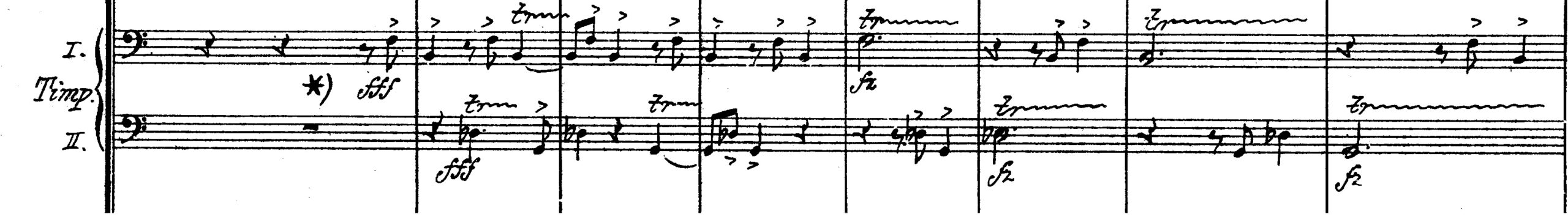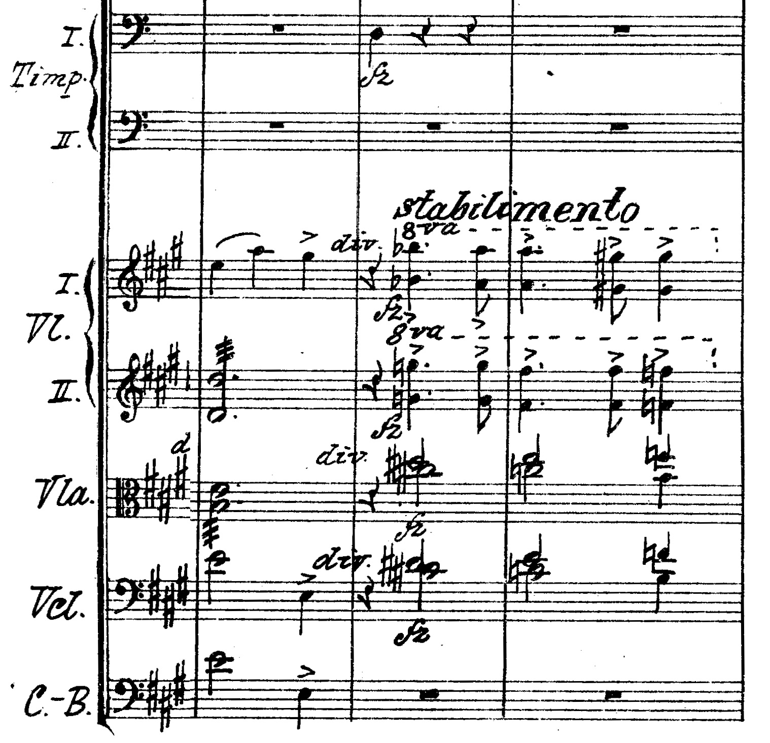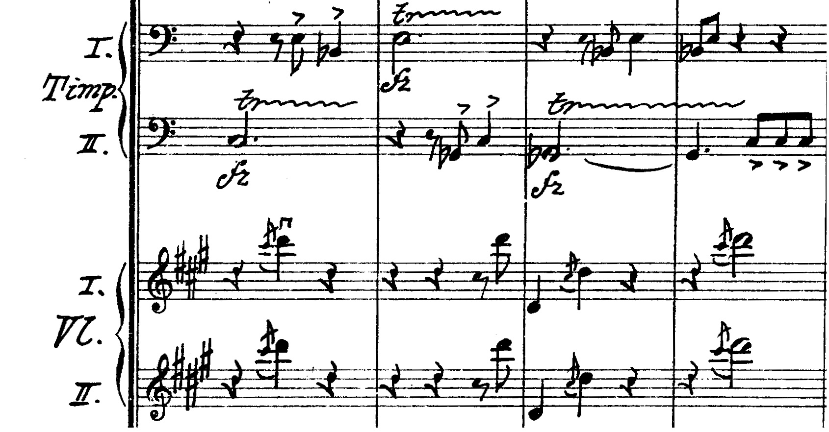 Intensiteten i strygerne stiger, indtil det pludselig kulminerer med 4 slag på pauken – der også foregriber en rolle pauken får senere – og orkesteret stopper helt.
