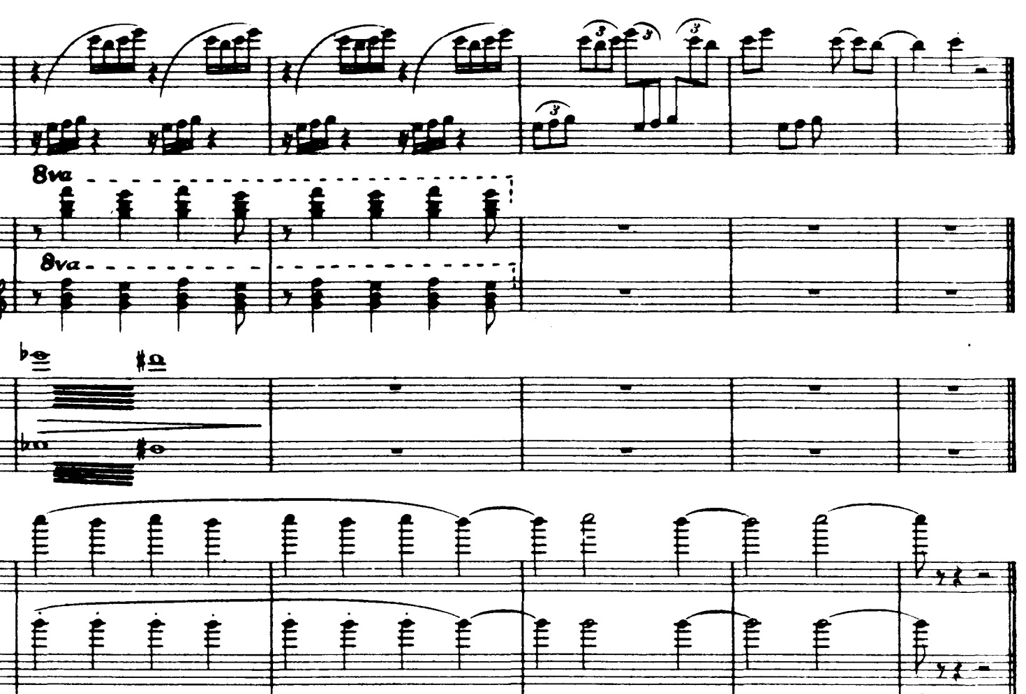 Strygergruppens spil bliver mere og mere intenst, indtil det tredje tema nærmest vokser ud af deres samspil. Dette består af nogle spring, oppefra og ned, som gentages og flyttes: