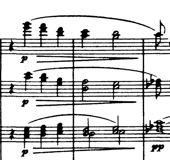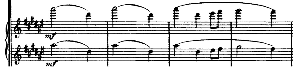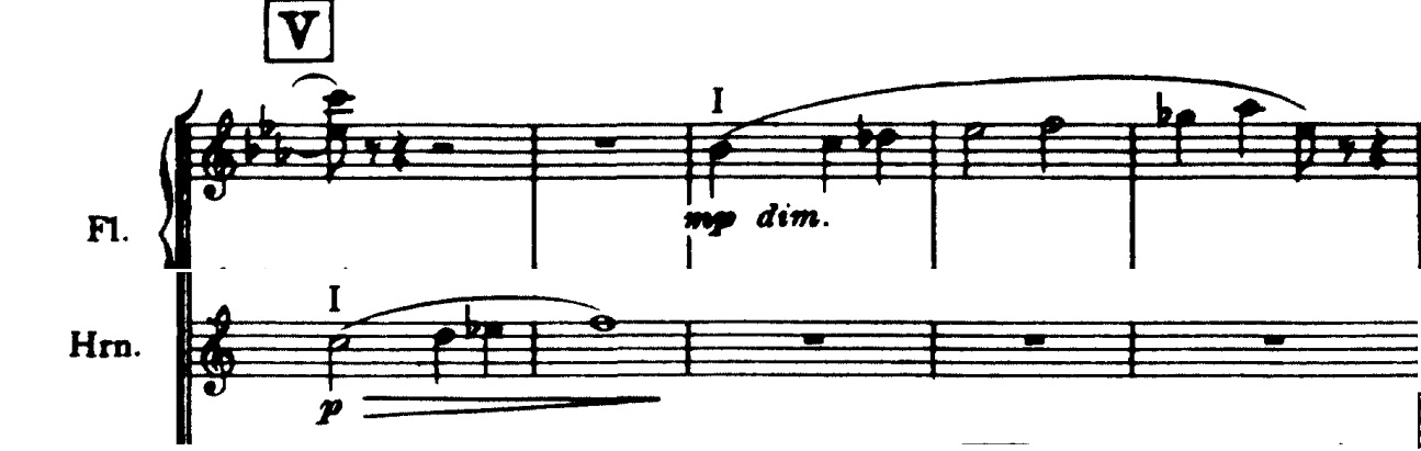 Denne gentages lige derefter, men bliver nu besvaret af træblæserne med nedadgående modstykker i fløjte og obo, og en medstemme i klarinet: