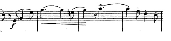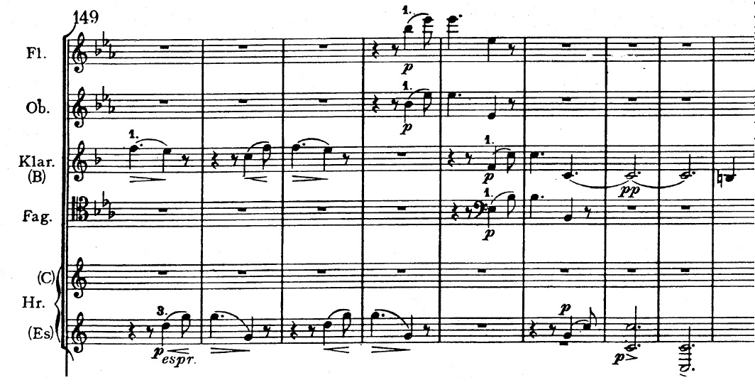 Efter en let gennemarbejdning af dette tema, vender det tilbage, nu flyttet op i fagotter og klarinetter. Bemærk hvordan akkompagnementet i strygerne er radikalt anderledes, meget mere dak-dak-dak, end det dynamiske da-di-da-di vi hørte før: