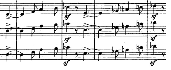 Intensiteten stiger drastisk i det følgende stykke, men vi præsenteres i virvaret kort for de to første temaer. Først tema 1, eller ihvertfald et ekko af den, i de dybe strygere: