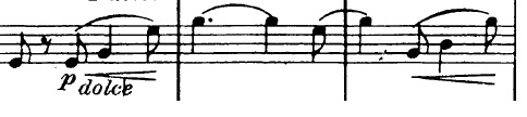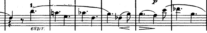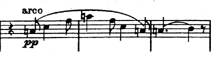 Tema nr. 2 når kun lige akkurart at dø hen, før bratscherne istemmer det tredje og sidste tema, en nedadgående figur på tre toner, som violinen snart overtager og bratschen straks giver et modsvar til: